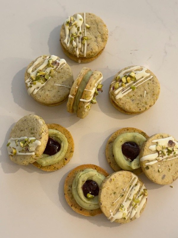 relleno con ganache de pistacho y centro de frambuesa